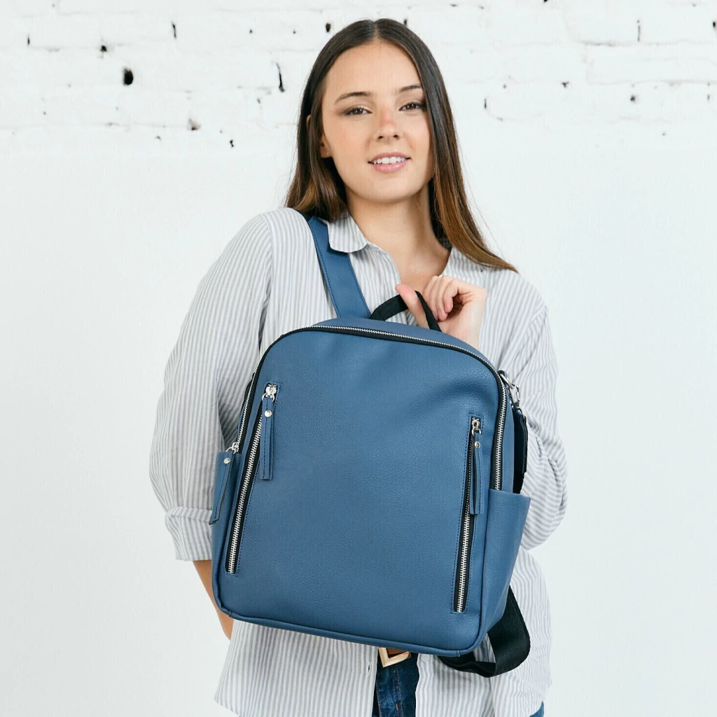 Cierre de metal en abertura principal + doble bolsillo frontal con cierre